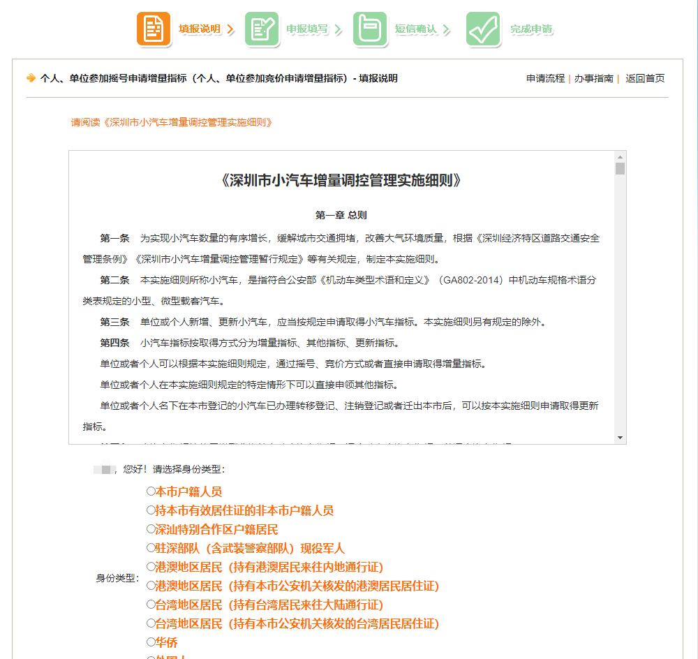 小伙伴们可以在手机端或网页端提出申请,手机端即在【“深圳交通”公众号-微服务-小汽车摇号】进入申请页面,网页端的申请流程如下 ?