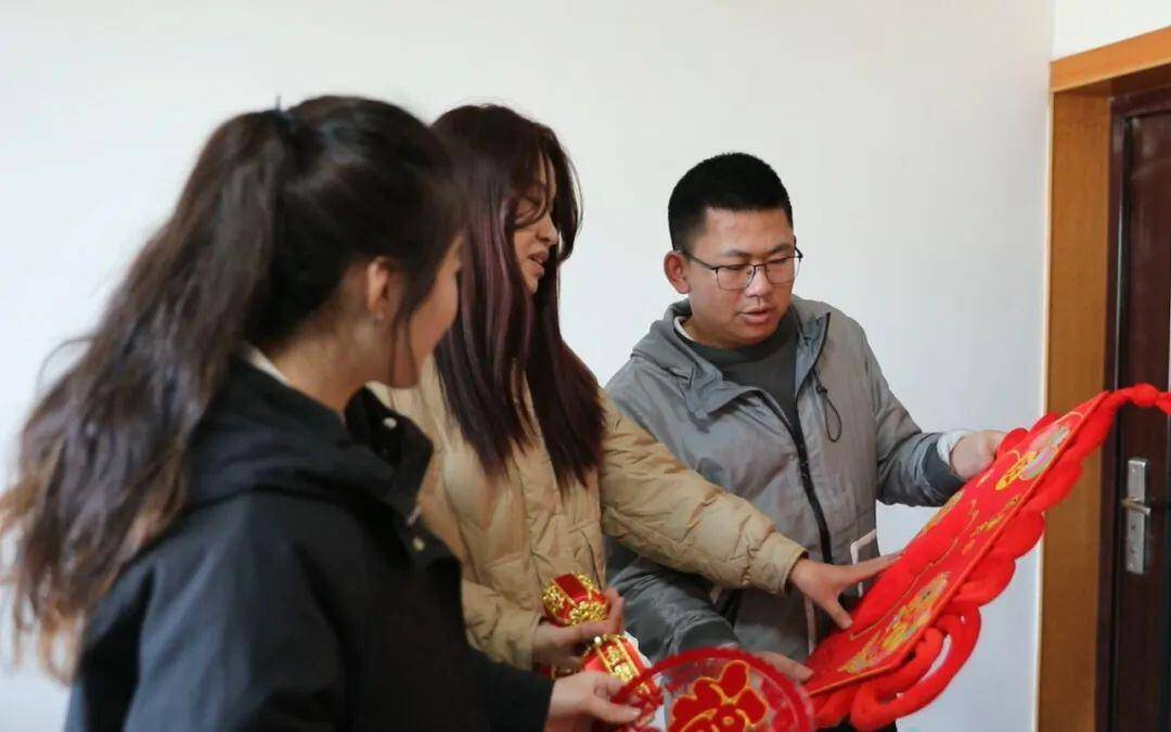 大家一边挂灯笼、贴窗花