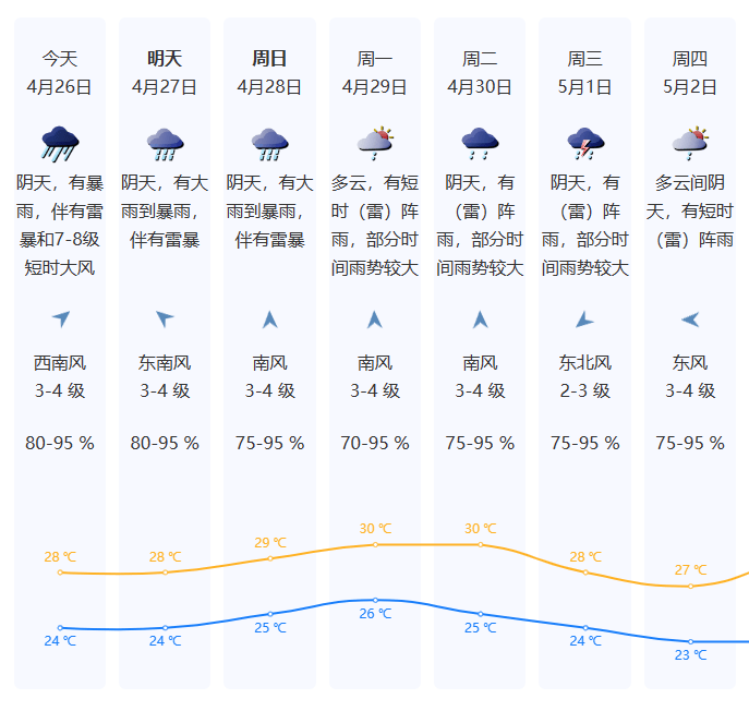未来一周我市(含深汕)仍处于降雨集中期,暴雨和强对流风险高。27-28日雷雨频密,仍有暴雨;29日有(雷)阵雨;展望30日-5月2日天气仍不稳定,有(雷)阵雨,部分时间雨势较大。